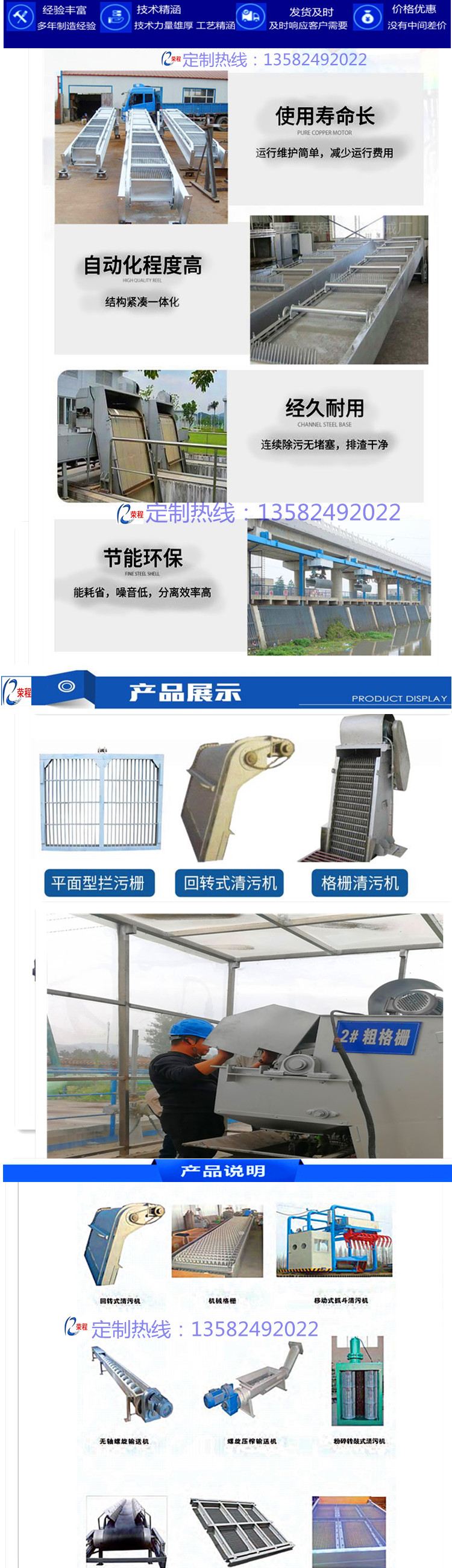 回轉(zhuǎn)式格柵除污機(jī)是一種可以連續(xù)自動攔截并清除流體中各種形狀雜物的水處理專用設(shè)備,可廣泛地應(yīng)用于城市污水處理。自來水行業(yè)、電廠進(jìn)水口,同時也可以作為紡織、食品加工、造紙、皮革等行業(yè)廢水處理工藝中的前級篩分設(shè)備。