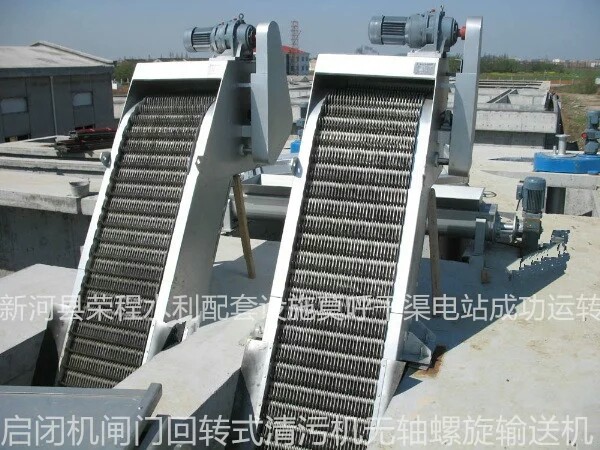 旋轉格柵除污機是由一個獨特的耙廠組裝成一組旋轉柵格鏈組成的。在電機減速器的驅動下,耙鏈的鏈條與水流相反。